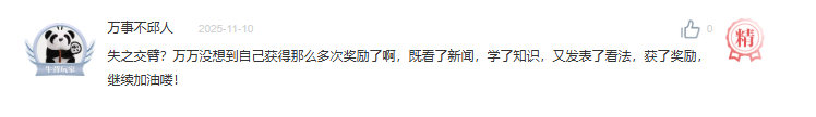 @万事不邱人 是来自成都的邱女士,2025年10月、11月,她的悦评榜上榜次数均与获奖者相同,但终因加精条数不足“败下阵来”,在过去两个月的明星用户新闻稿下,@万事不邱人 都持续留言,表示自己要争取上榜。