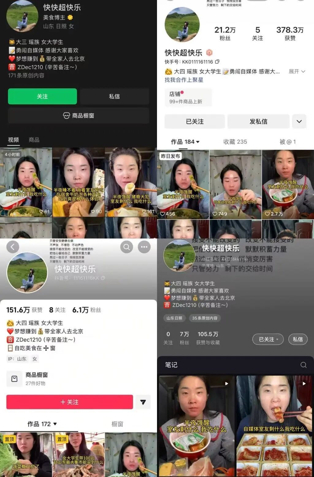 据悉,博主“快快超快乐”自称是大四在读学生,IP位于山东,在快手、小红书、抖音等多个社交平台都开了账号,还在橱窗里卖零食、日用品等商品。单看粉丝数据,她的快手账号有21.2万粉丝、378.1万获赞,小红书7万粉丝、105.5万获赞收藏,抖音也有6.1万粉丝、151.6万获赞,微信视频号还认证了“美食博主”,算是小有名气的吃播。