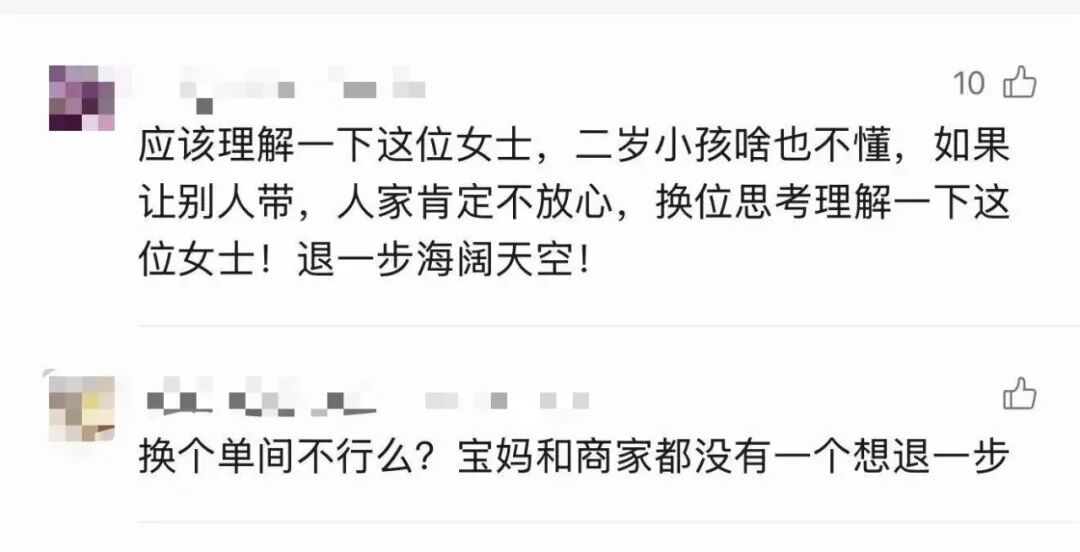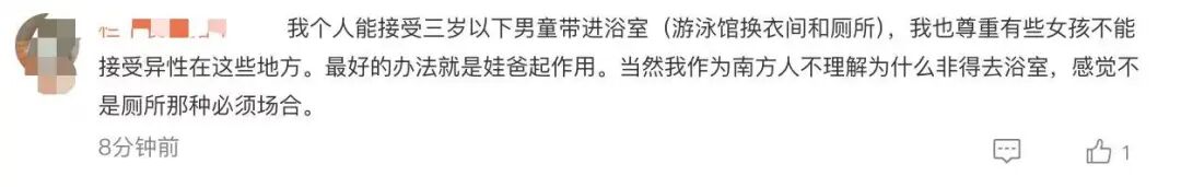 也有网友表示理解,“二岁小孩啥也不懂,肯定不放心交给陌生人带,换位思考理解一下吧”“我个人能接受三岁以下男童带进浴室(游泳馆换衣间和厕所),我也尊重有些女孩不能接受异性在这些地方。”
