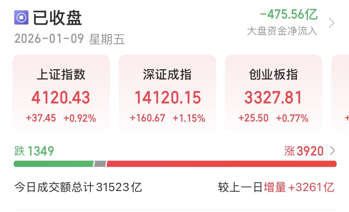 1月9日,A股三大指数延续上攻步伐,沪指一举站上4100点整数关口,创逾十年以来新高。截至收盘,沪指涨0.92%,收报4120.43点;深成指涨1.15%,收报14120.15点;创业板指涨0.77%,收报3327.81点。