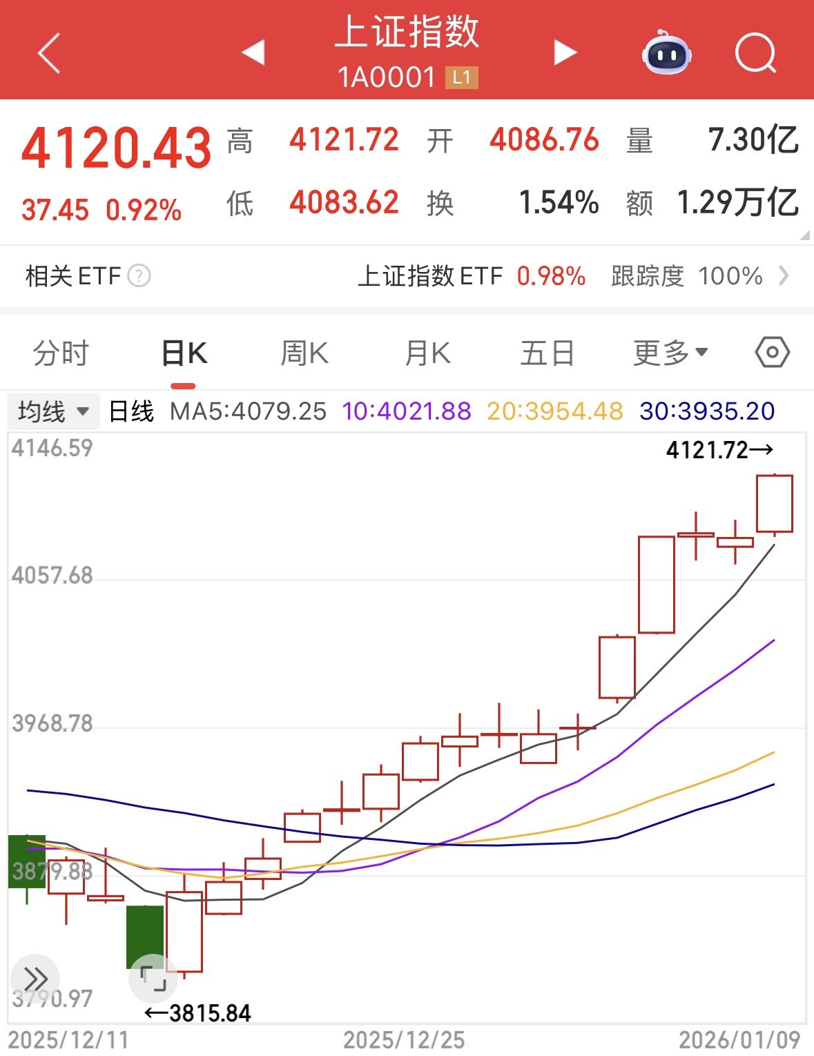 2026年第一周的交易日已经结束,从指数表现来看,可谓是为全年股市开了一个好头。尤其是沪指,从12月17日起,仅用十余个交易日便从3800点区间强势突围,一举站上4100点整数关口,也为投资者带来实打实的赚钱效应。