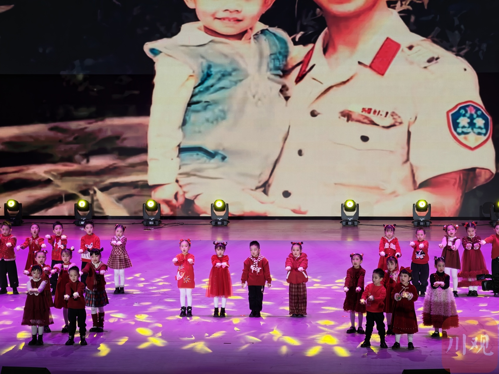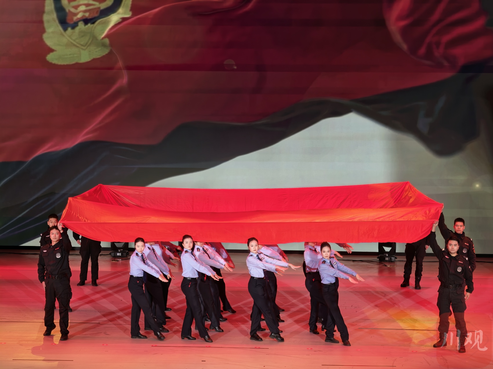 在文艺汇演环节,“致敬忠诚”“守护平安”“护航安澜”三个篇章陆续上演,开场歌舞《光荣集结在警旗下》气势恢宏;情景剧《硕勋故里“追枫人”》生动展现基层派出所为民服务的“枫桥经验”;童声合唱《花开忘忧》纯净感人;战术表演《雷霆战警》则彰显了特警队伍的过硬本领与威武气势。音舞诗画、方言朗诵、歌曲联唱等节目轮番登场,多角度、多层面呈现了宜宾公安的铁军风采与赤子情怀。