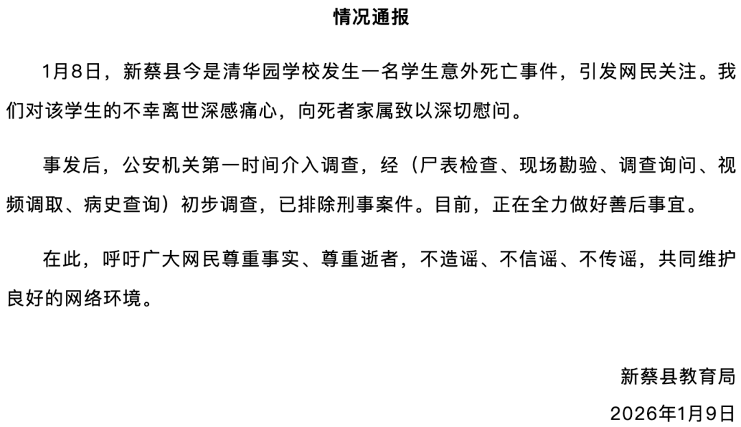 1月8日,新蔡县今是清华园学校发生一名学生意外死亡事件,引发网民关注。我们对该学生的不幸离世深感痛心,向死者家属致以深切慰问。
