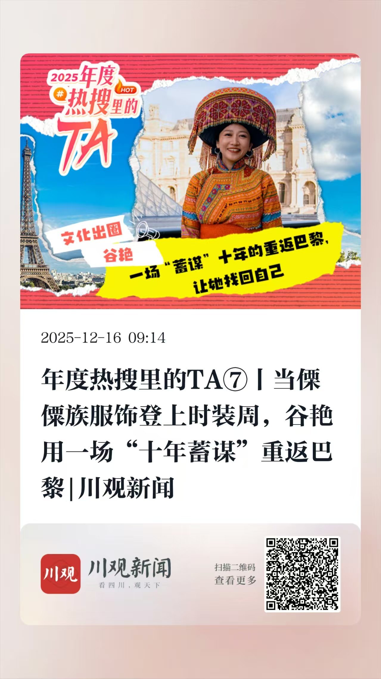 2025年10月,盐边傈僳族服饰与巴黎高定品牌携手亮相中法时装周,引得国内外媒体竞相关注,全球曝光量超5亿。作为主要策划者之一,法国留学归来的谷艳说,为了这场联合大秀,她“蓄谋”十年得以重返巴黎,而这也让她重新“找回了自己”。跟着#2025年度热搜里的TA#,看#攀枝花姑娘如何把家乡文化送上时装周#。