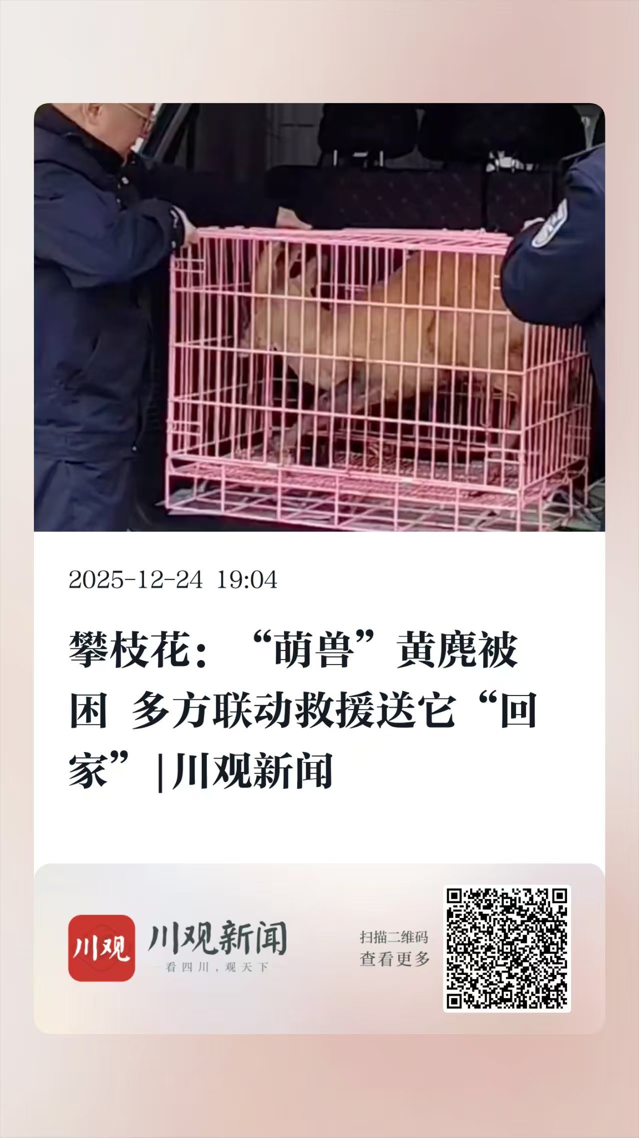 12月23日凌晨,攀枝花市公安局西区分局清香坪派出所接到群众求助,称一处路坎下有野生动物被困,无法自行脱困,民警火速赶赴现场。这只“萌兽”身形似鹿,毛色棕黄,动作略显局促,经辨认系国家二级保护动物“黄麂”。由于黄麂生性胆小,且被困位置地形复杂,为避免其受惊受伤,民警第一时间联系消防救援人员前来支援,最终成功将这只被困麂子救出。经检查,这只黄麂体表无严重外伤,精神状态稳定,已被放生至适宜的野外区域。