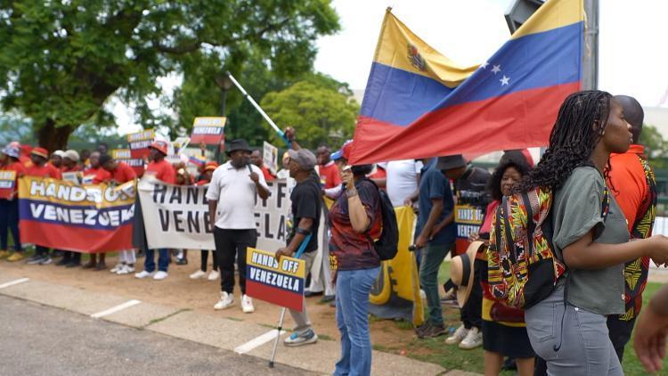 当地时间8日中午,南非民众在位于行政首都比勒陀利亚的美国驻南非大使馆前举行集会,高喊“停止干涉委内瑞拉”等口号,抗议美国对委内瑞拉实施军事打击。