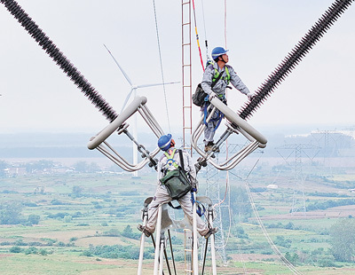 安徽省滁州市柳巷镇,检修人员在100多米的高空进行检修作业,确保“西电东送”特高压大动脉安全稳定运行。 宋卫星摄(影像中国)