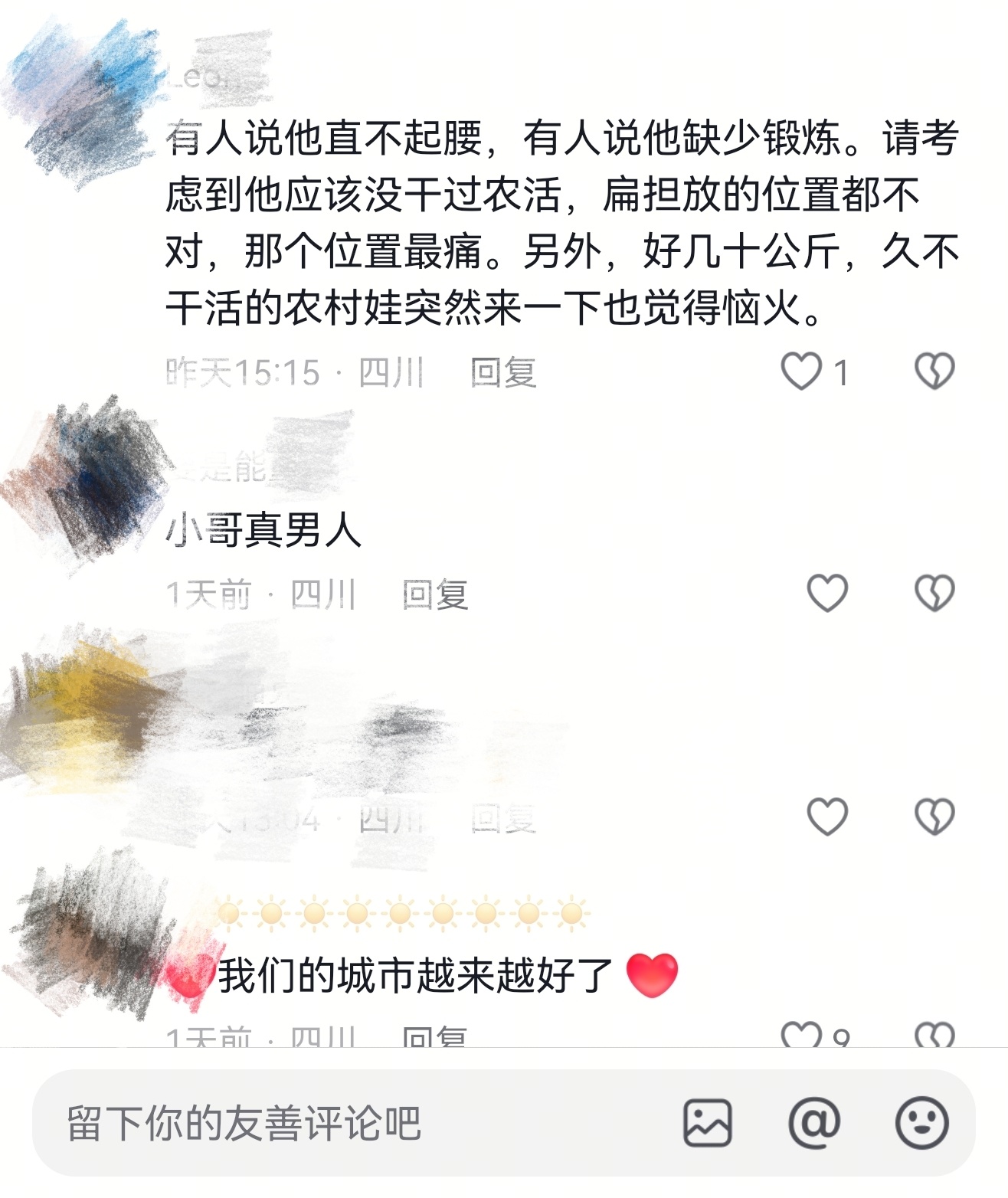 阿姨的脸上,始终挂着淳朴而感激的笑容。这个看似寻常的瞬间被记录下来,迅速在网上传开。网友们纷纷评论:“小哥眼睛都在用力!”“我感觉有100斤。”“虽然完全不会担,但还是接过来了。”“最暖的重量,是愿意为他人的不易弯下肩膀!”