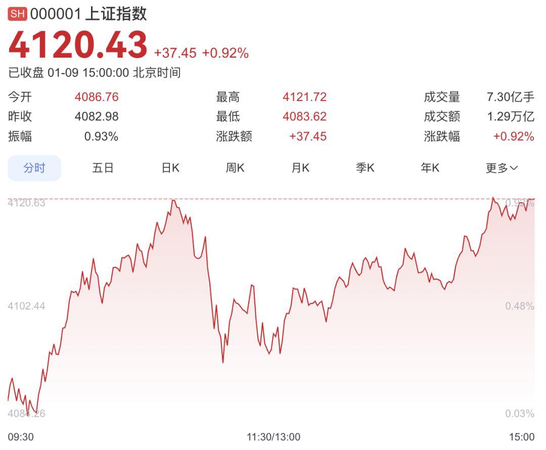 1月9日,A股三大指数集体上涨,截至收盘,上证指数涨0.92%站上4100点,深证成指涨1.15%,创业板指涨0.77%;北证50涨1.05%。