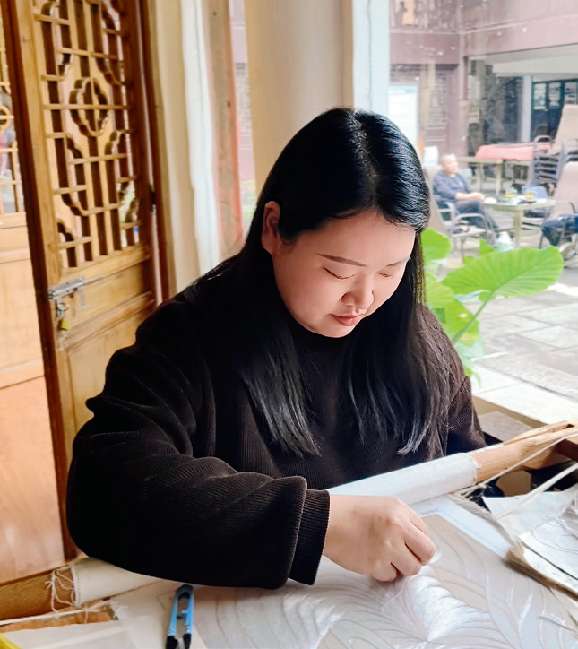 通过持续开展“非遗进社区”“技艺进校园”活动,蒲彩虹把观音绣和扎染体验课带到市民和孩子们身边。在遂宁市安居区第四小学校的课堂上,有个女孩用白色丝线为竹叶绣出“高光”:“因为阳光照在这里呀!”童稚的创意让蒲彩虹感动:“传承不是复制,而是让每个人找到自己的表达。”这些点点滴滴的推广,不断为黄海彦带领的“遂州绣娘”团队注入新的市场资源,让居家就业的绣娘们的手艺被更多人看见、喜爱。