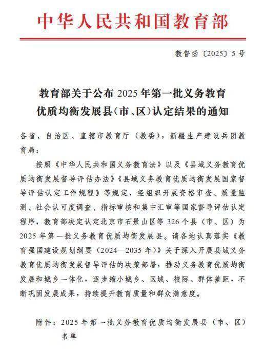 近日,教育部正式公布2025年全国义务教育优质均衡发展县(市、区)名单。经资格审查、质量监测、社会认可度调查、指标审核和集中汇审等国家督导评估认定程序,成都市新津区被教育部认定为全国义务教育优质均衡发展区。