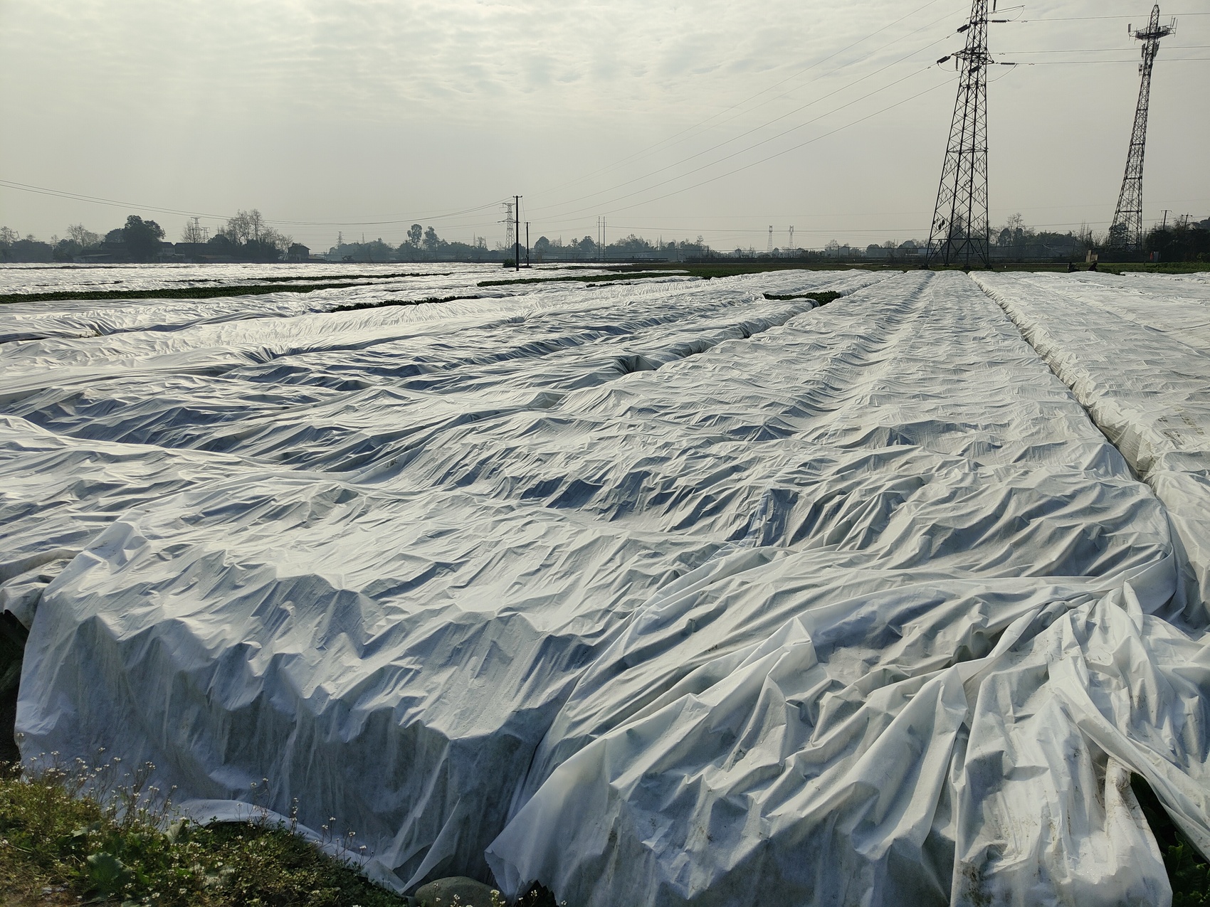 记者注意到,在一片绿意之中,不少菜地上好似覆盖一层厚厚的白雪。走近一看,原来是盖上了一层白色薄膜。