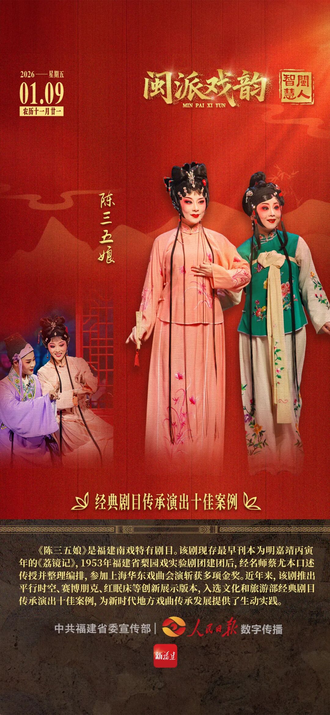 《陈三五娘》是福建南戏特有剧目。该剧现存最早刊本为明嘉靖丙寅年的《荔镜记》,1953年福建省梨园戏实验剧团建团后,经名师蔡尤本口述传授并整理编排,参加上海华东戏曲会演斩获多项金奖。近年来,该剧推出平行时空、赛博朋克、红眠床等创新展示版本,入选文化和旅游部经典剧目传承演出十佳案例,为新时代地方戏曲传承发展提供了生动实践。