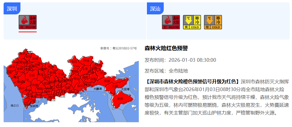 本周早晚持续寒冷,请注意做好防寒保暖及预防一氧化碳中毒等相关工作。全市(含深汕特别合作区)森林火险红色预警信号生效中,请继续做好森林防火及家庭用火用电安全管理。