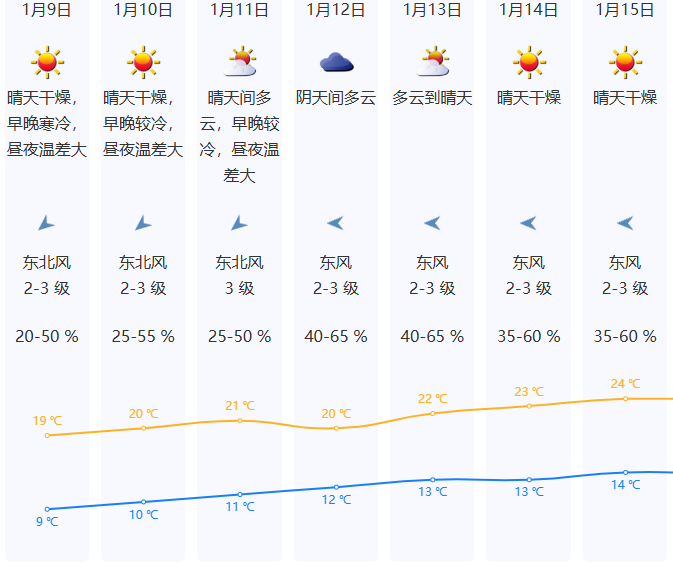 预计9日持续晴天干燥,昼夜温差大,早晚寒冷,气温9-19℃;