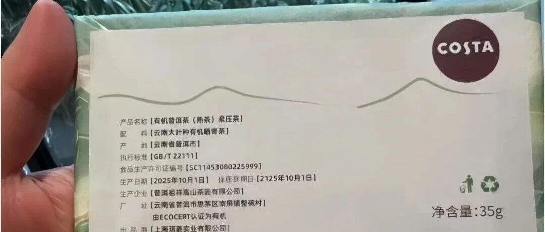 据中新经纬消息,近日,有消费者向反映,其在电商平台购买的COSTA有机普洱茶(熟茶)紧压茶产品盒包装显示,该款产品的生产日期为2025年10月1日,保质到期日为2125年10月1日,保质期长达100年。