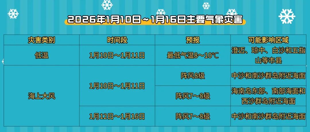 1月10日~11日,海南岛仍维持晴冷天气,早晚温差较大,中部山区和西北部内陆地区8~10℃;老、弱、幼等敏感人群和有慢性基础性疾病的人群需注意保暖,减少高血压等心脑血管疾病和呼吸系统疾病的发生风险。