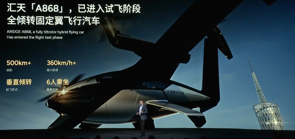 活动上,小鹏汽车董事长、CEO何小鹏展示了全新的“汇天A868飞行汽车”。