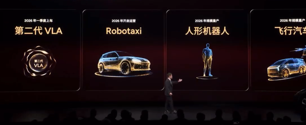 直播中,何小鹏表示,2026年,小鹏将迎来物理AI的落地与规模量产,正式开启从技术探索向实践应用的关键跨越。2026年第一季度第二代VLA上车;2026年开启运营Robotaxi;2026年规模量产人形机器人;2026年规模量产飞行汽车。
