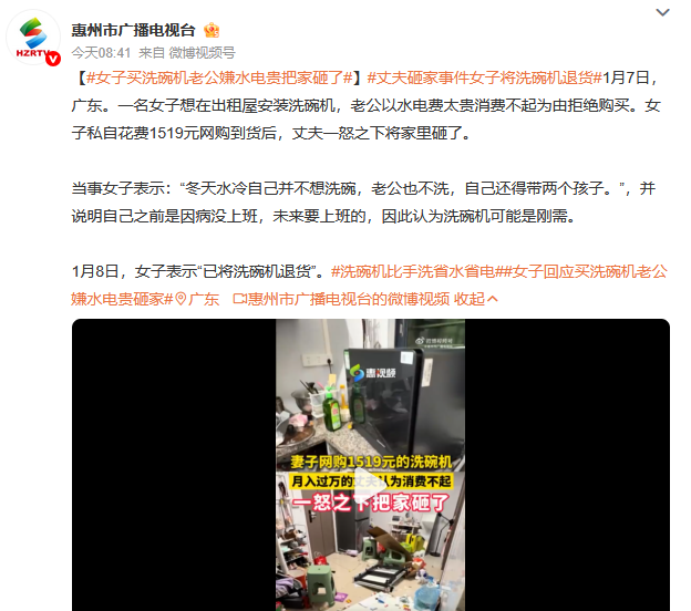1月7日,广东。一名女子想在出租屋安装洗碗机,老公以水电费太贵消费不起为由拒绝购买。女子私自花费1519元网购到货后,丈夫一怒之下将家里砸了。