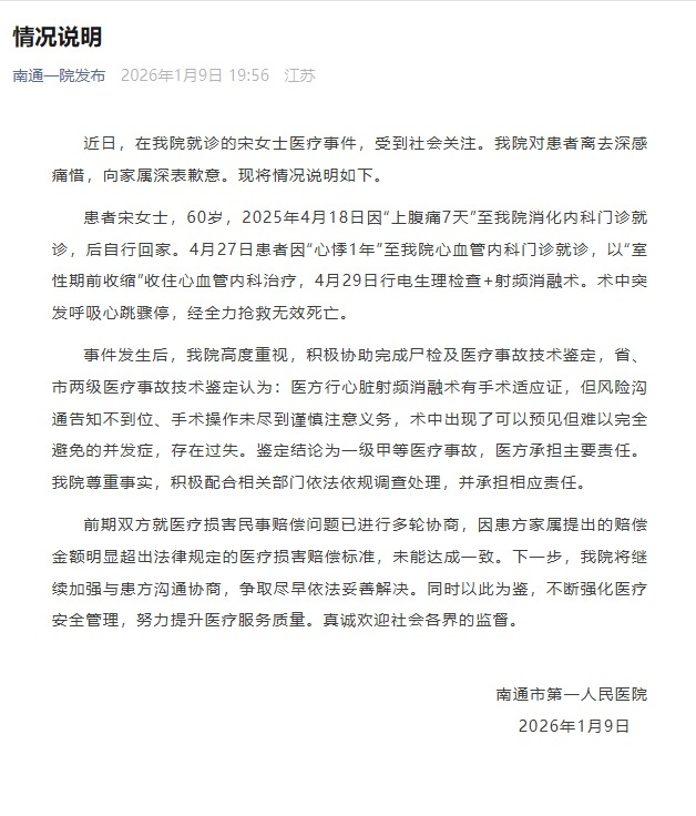 事件发生后,我院高度重视,积极协助完成尸检及医疗事故技术鉴定,省、市两级医疗事故技术鉴定认为:医方行心脏射频消融术有手术适应证,但风险沟通告知不到位、手术操作未尽到谨慎注意义务,术中出现了可以预见但难以完全避免的并发症,存在过失。鉴定结论为一级甲等医疗事故,医方承担主要责任。我院尊重事实,积极配合相关部门依法依规调查处理,并承担相应责任。