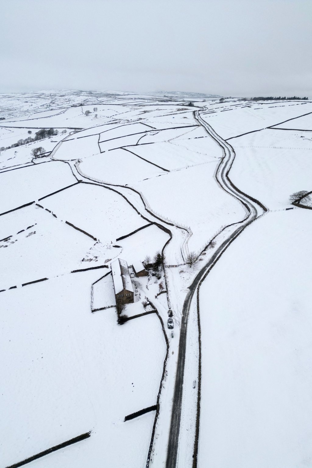 这是1月9日在英国西约克郡霍姆弗斯拍摄的冰雪覆盖的田野和房屋(航拍照片)。