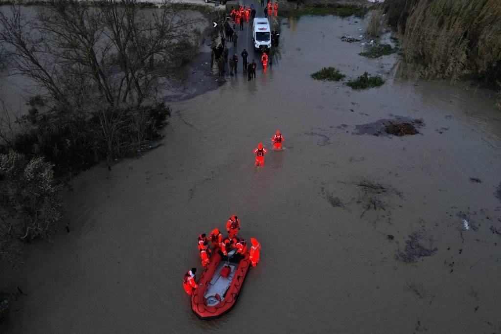 1月8日,在阿尔巴尼亚费拉斯,军人在洪水中参与疏散行动(无人机照片)。