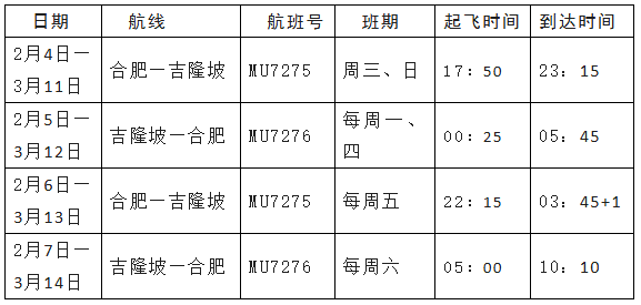 合肥机场将首次开通至吉隆坡航线,