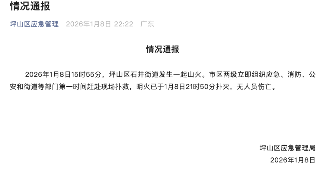 1月8日晚,深圳坪山区应急管理局发布情况通报: