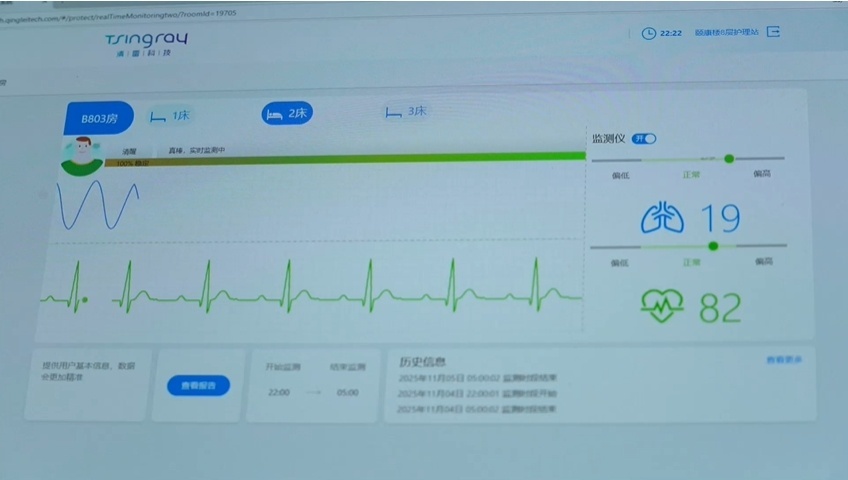房间内,每张床边都配有智能生命体征监测设备,24小时监测老人的呼吸、心率和睡眠等状况,实时向护理人员发出提示或警报;