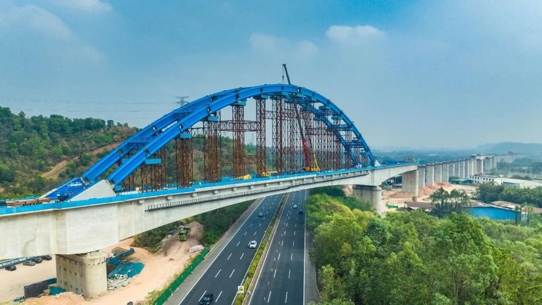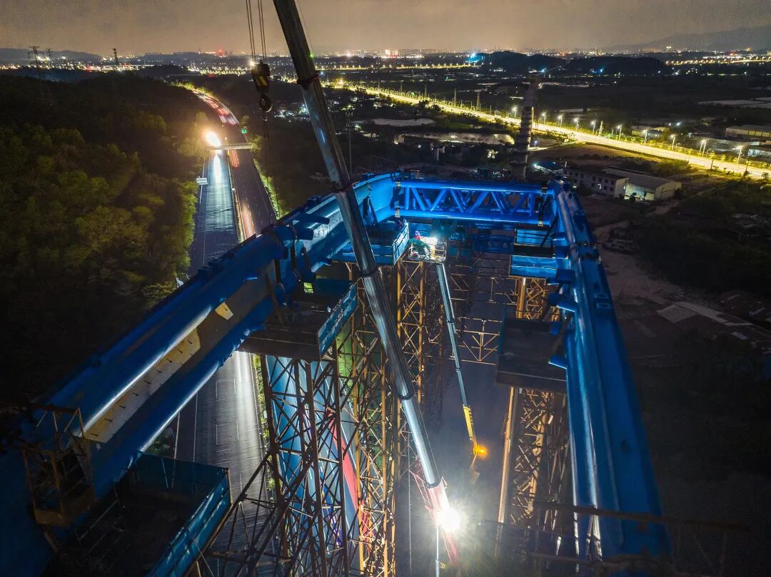 面对挑战,项目团队精心筹划,科学组织,提前进行施工风险评估,并组织专家评审,对施工结构建立建筑信息模型,对预应力管道及支架结构等提前碰撞。施工过程中,项目团队对支架进行全周期应力、变形监测,对拱肋进行温度、应力监测和拱肋声发射脱空检测等,并与高速管理单位建立安全联动机制,全面确保施工全周期安全、质量、节点工期有序可控。