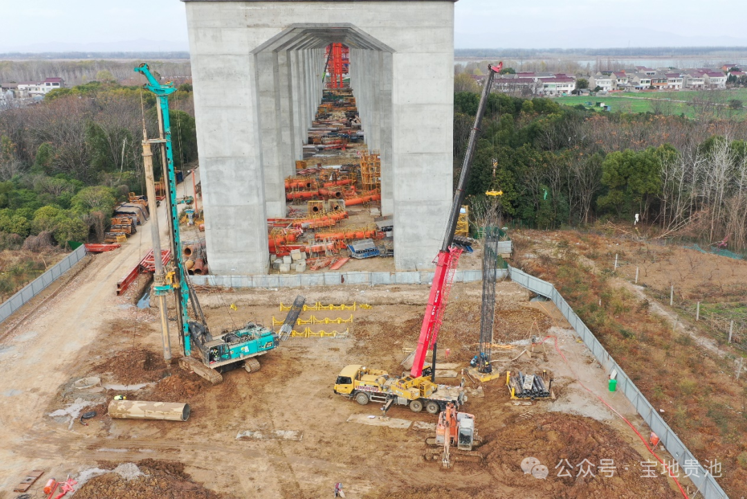 伴随着强劲有力的轰鸣声,记者在合池铁路公铁合建特大桥施工现场看到,40余名建设者各司其职,挖掘机、起重机、旋挖钻机等大型设备来回穿梭,巨大的钻机破土入地,已有40余根超50米深的钻孔灌注桩在此精准“生根”。