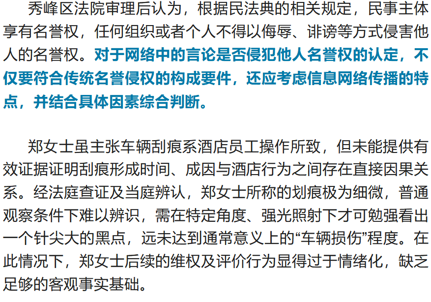 酒店认为,郑女士车辆上的刮痕无法证实是在停车开门时造成的,且刮痕形态与立体车库中不锈钢圆形柱可能造成的刮痕不符,不可能是此次刮碰导致。郑女士在没有充分证据证明车辆刮痕系酒店工作人员造成的情况下,发布上述带有贬损性质的言论,严重侵害了酒店的名誉。为此,酒店将郑女士诉至秀峰区法院,要求其删除评论、公开赔礼道歉,并赔偿经济损失1万元及律师费支出4000元。