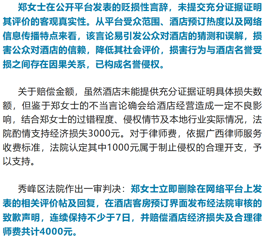 此后,郑女士以其个人账号在客房预订平台对该酒店发布评价帖及多条跟帖评论,详细描述了停车过程中车门被刮,酒店拒不承认、拒绝赔偿且态度恶劣等情况,并在评论中使用“来桂林千万不要住这家酒店”“酒店停车位太垃圾了”“真是没有诚信可言”等表述。