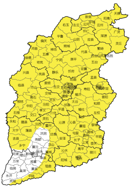 2026年01月09日15时34分,山西省气象台变更大风黄色预警,预警区域为大同市、朔州市、忻州市、吕梁市、太原市、晋中市、阳泉市、临汾市、运城市、长治市、晋城市。
