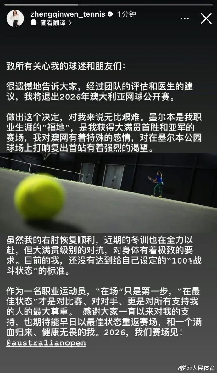 据人民体育微博消息,1月8日,郑钦文通过个人社交平台宣布将退出2026年澳网。