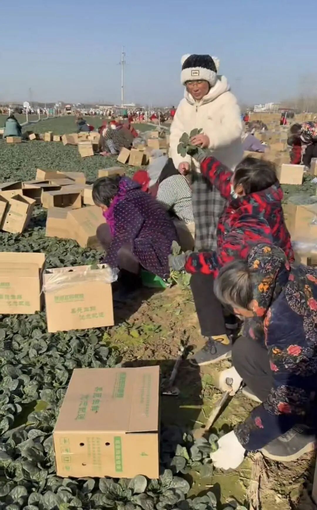 如今,她动员了附近三个乡镇约五六百名老年妇女下地摘菜,“从地这头到那头,人挨着人,还是赶不及”。