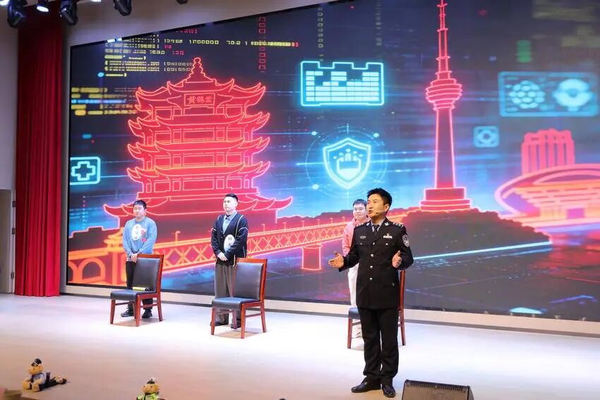 为了让网络安全知识更易于理解和记忆,网安支队的民警们还自编自导自演了一出原创情景剧《黄鹤楼下话网安》。民警们化身“演员”,用幽默风趣的表演,将“种木马”、“毒链接”、“卖信息”等网络“毒瘤”生动地展现出来,让学生在开怀大笑的同时,也牢牢记住了网络安全要领。活动的最后,警校双方共同唱响了网络安全主题歌曲,在激昂的旋律中,守护清朗网络空间的信念深入人心。