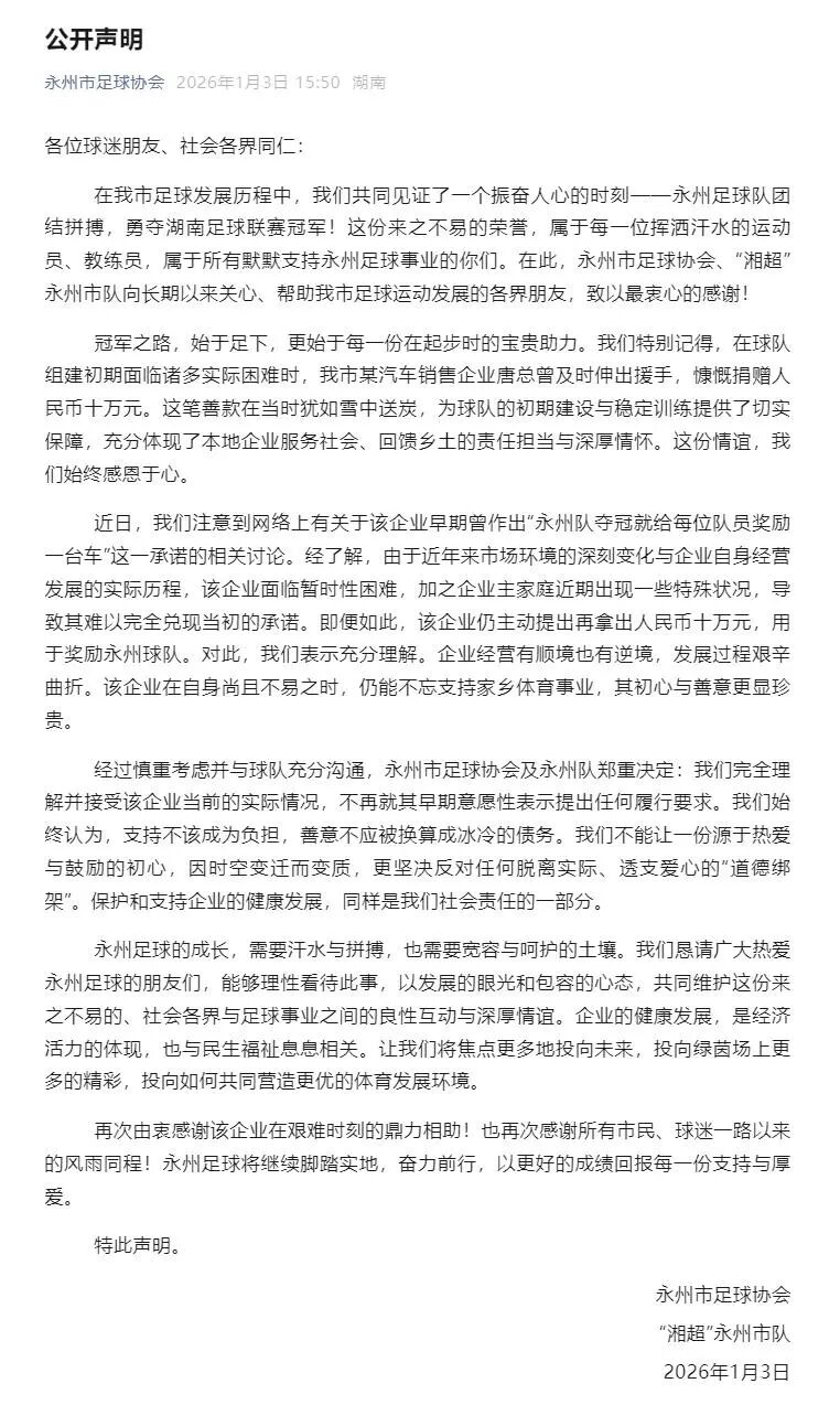 2026年1月3日,永州市足球协会、“湘超”永州市队发布公开声明,称经过慎重考虑并与球队充分沟通,不再就该企业早期意愿性表示提出任何履行要求。“支持不该成为负担,善意不应被换算成冰冷的债务”的态度,算是为这起引发广大网友围观的“送车”事件画上了一个句号。