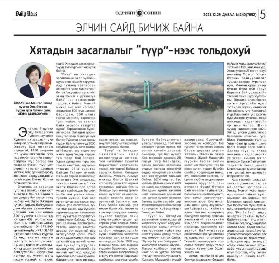 2025年12月29日,驻蒙古大使沈敏娟在蒙古《日报》“中国大使谈中国之治”专栏以及蒙古主流媒体蒙古新闻网发表署名文章《“桥”见中国之治》。全文如下: