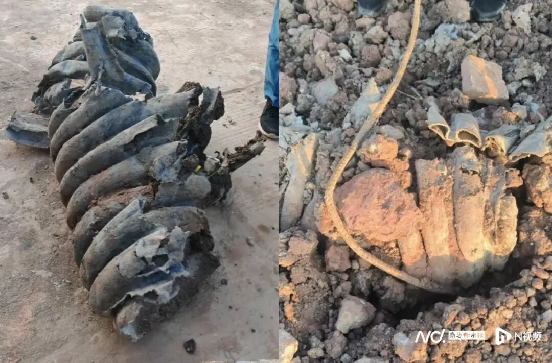 检查组挖出的厂区外波纹管(左)和厂区内部波纹管(右)。图源:东莞生态环境