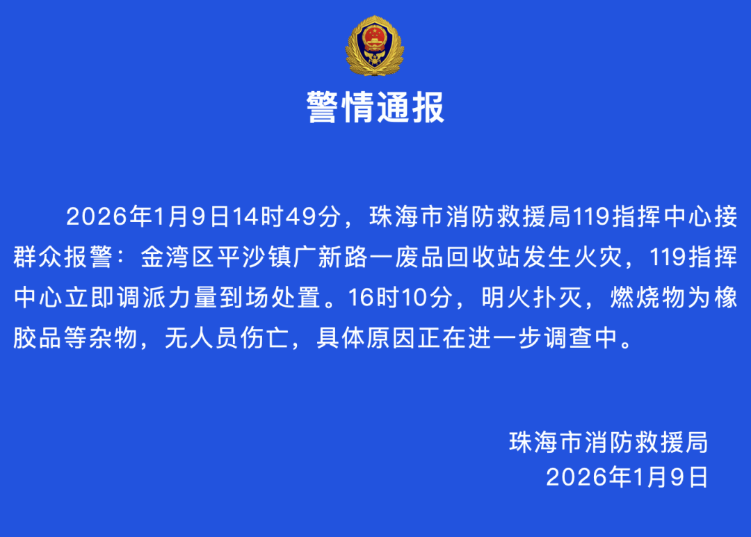 当天17时,珠海市消防救援局通过公众号发布警情通报显示,起火地点为平沙镇广新路一废品回收站。16时10分,明火扑灭,燃烧物为橡胶品等杂物,无人员伤亡。具体原因正在进一步调查中。