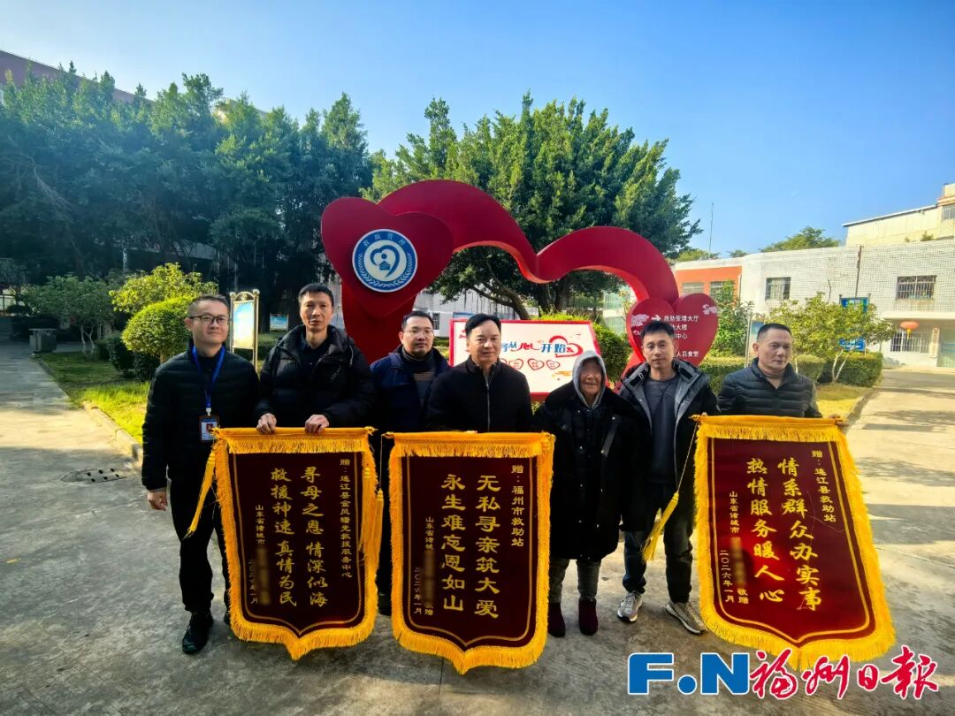 现场,三面分别赠予福州市救助站、连江县救助站和连江县金凤曙光救援服务中心的锦旗,无声诉说着一个家庭跨越四分之一个世纪后重获团圆的感激。背后是福州市与连江县救助站的高效协作,通过AI方言比对、抖音寻人等现代技术手段,共同为七旬老人照亮了回家路。