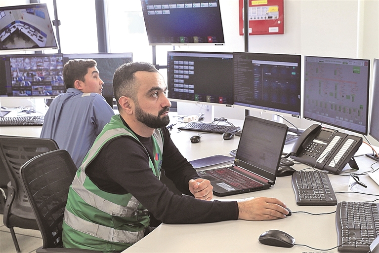 图为8日,在阿塞拜疆的希济-阿普歇伦风电项目现场,技术人员在控制中心监控风机和相关设备运行情况。新华社发