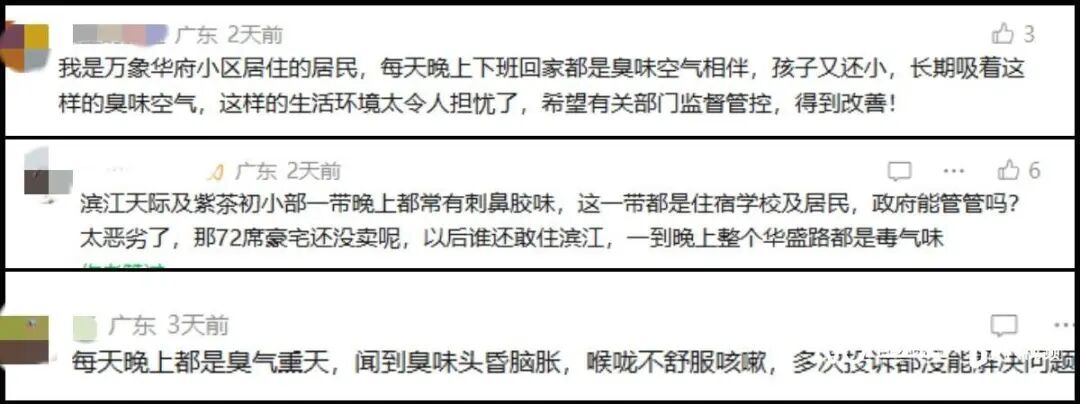 “我是万象华府小区居住的居民,每天晚上下班回家都是臭味空气相伴”“滨江天际及紫茶初小部一带晚上都常有刺鼻胶味”“晚上只要进入华盛路,就是那种工业废气味……”近日,广东江门市蓬江区华盛路多个小区业主反映晚上有烧胶的臭味,怀疑有工厂偷排,涉及万象华府、越秀滨江盛悦、滨江名院、美的远洋云著、滨江天际、壹桂府等多个小区。其中,万象华府业主反映臭味问题长期存在。