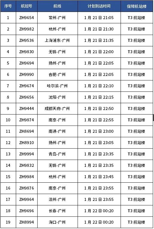 特别留意的是:部分计划到达时间在1月22日02:00前的国内进港航班将提前调整至T3航站楼保障,具体航班列表如下。