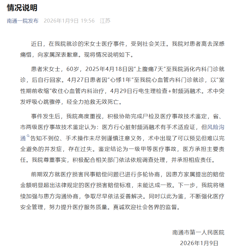 2026年1月9日,南通市第一人民医院发布情况说明,全文如下: