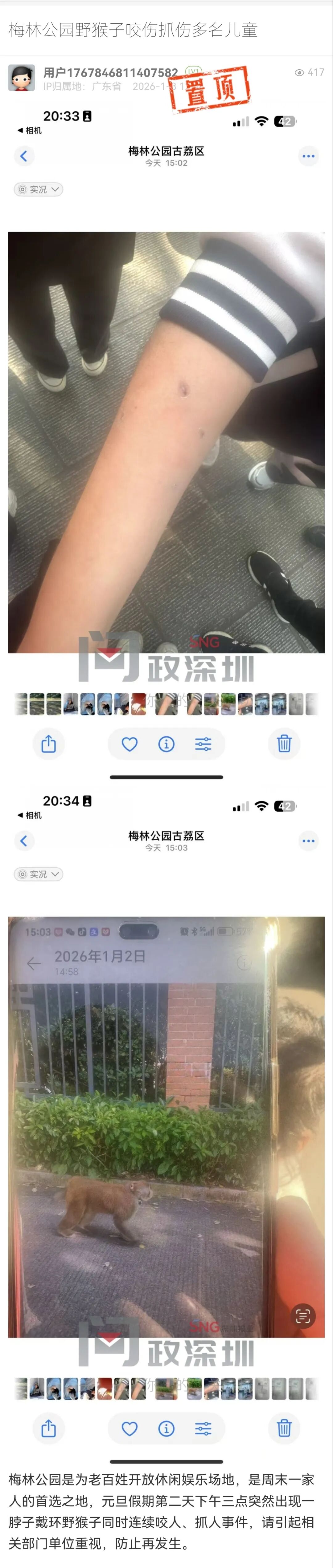 该市民表示梅林公园是为老百姓开放休闲娱乐场地,是周末一家人的首选之地,元旦假期第二天下午三点突然出现一脖子戴环野猴子同时连续咬人、抓人事件,请引起相关部门单位重视,防止再发生。