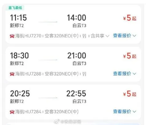 1月9日上午,全国多地网友发帖称,海航机票系统疑似出现问题,多个航线出现超低价票,有网友只需要花费5元买到从郑州到广州的机票,部分热门航线机票价低至几十元,上海至广州机票仅需60元,广州到北京的机票也只需100多元。