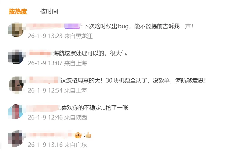 在该条公告评论区,有网友表示,“海航这波处理很大气”“30块钱机票全认了,够意思”。